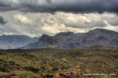 I wanted to stop in Tortilla Flat to get a mint chocolate chip ice cream cone, but the place was swarming with tourists. I drove on through. I stopped every now and then to get pictures of mountains and clouds.