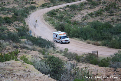 About 15 minutes later, an ambulance went by with lights flashing, siren going, and gravel flying.